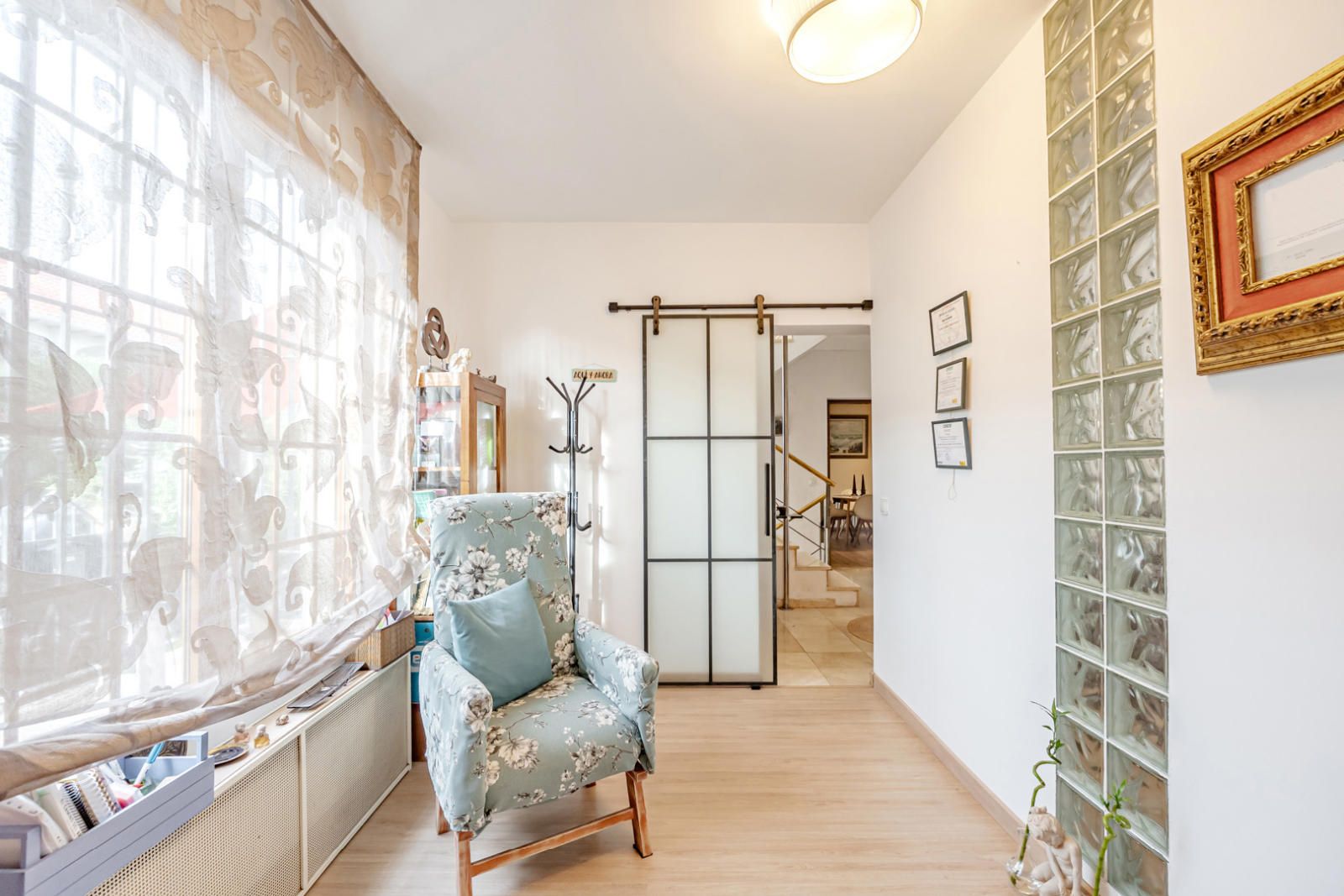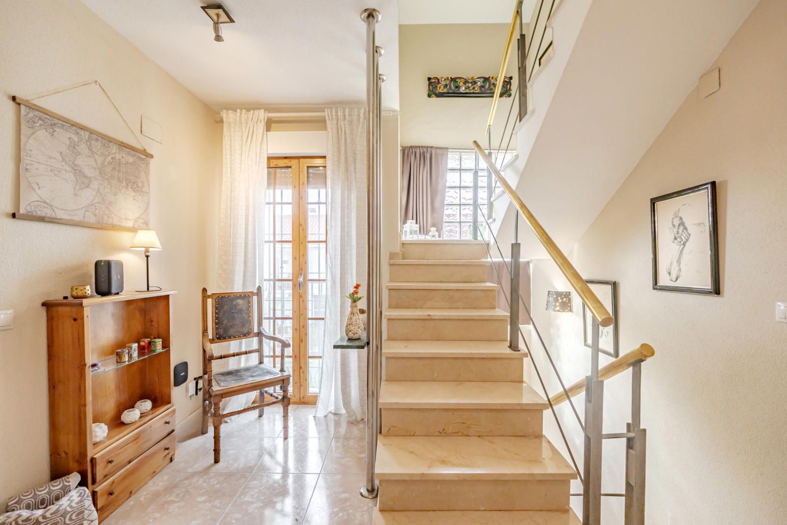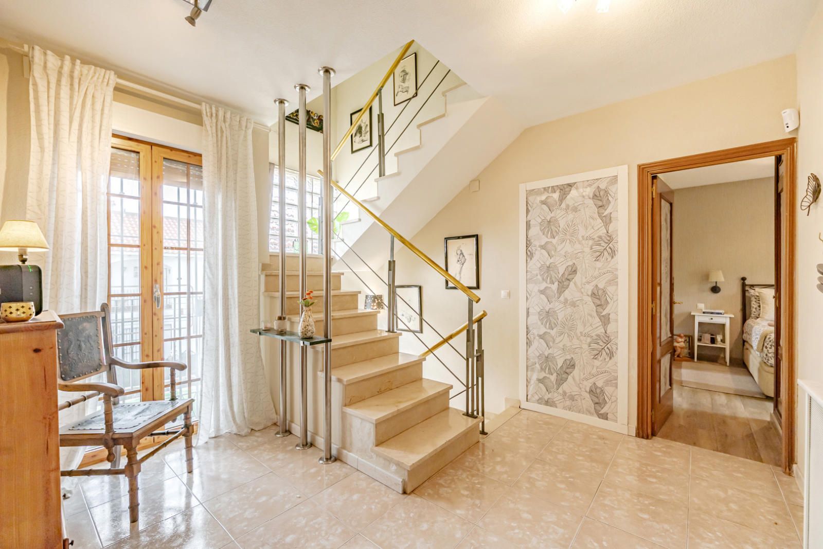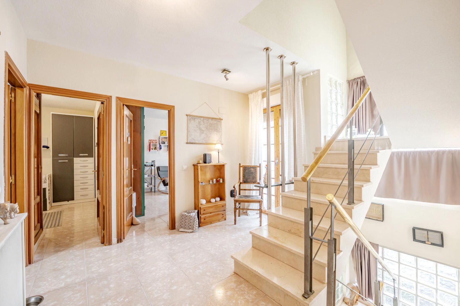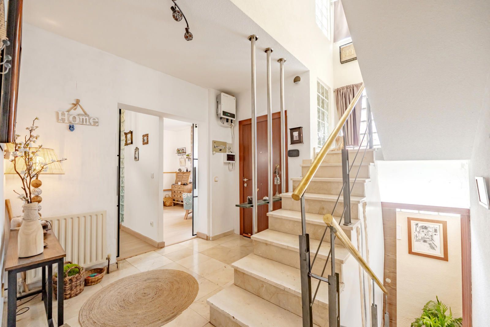 Al cruzar el umbral, la luz natural inunda el espacio, destacando los detalles de diseño. La planta baja da la bienvenida con un elegante recibidor que conduce a una escalera de mármol con barandilla moderna de hierro y acero, creando una sensación de ligereza y sofisticación. Los tonos neutros de las paredes y el suelo pulido potencian la luminosidad.