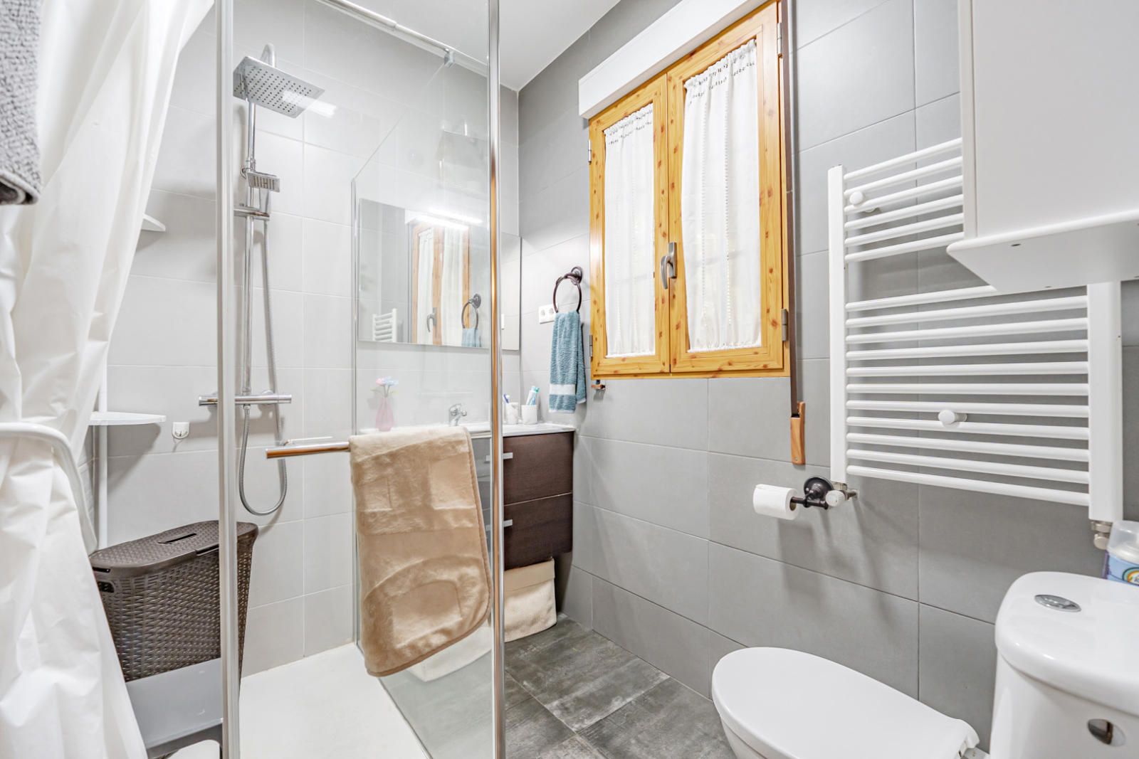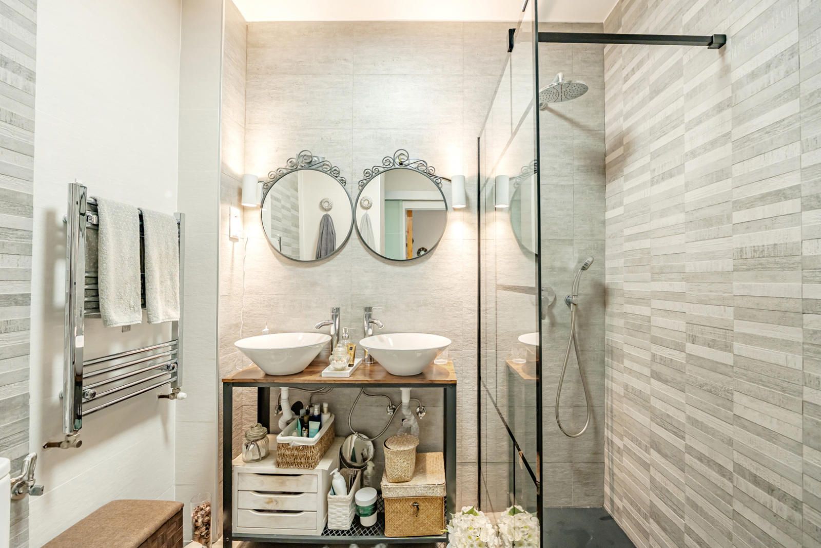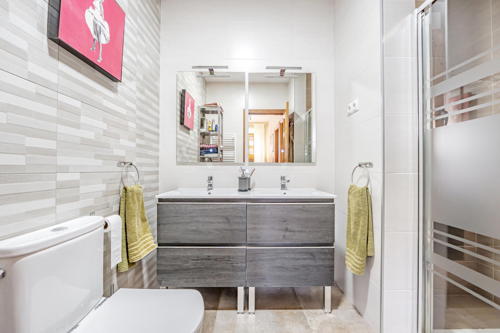 Los cuartos de baño han sido renovados con un estilo contemporáneo y funcional. Uno de ellos destaca por su doble lavabo sobre encimera, grifería moderna y una ducha con mampara de cristal de diseño, revestida con un elegante alicatado en relieve en tonos grises, ofreciendo un oasis de relajación.