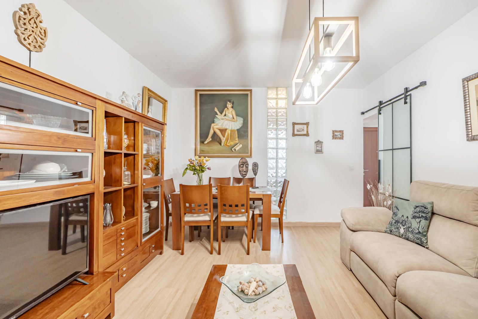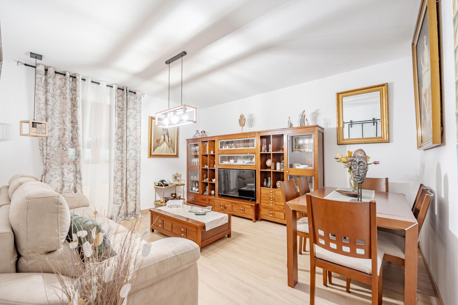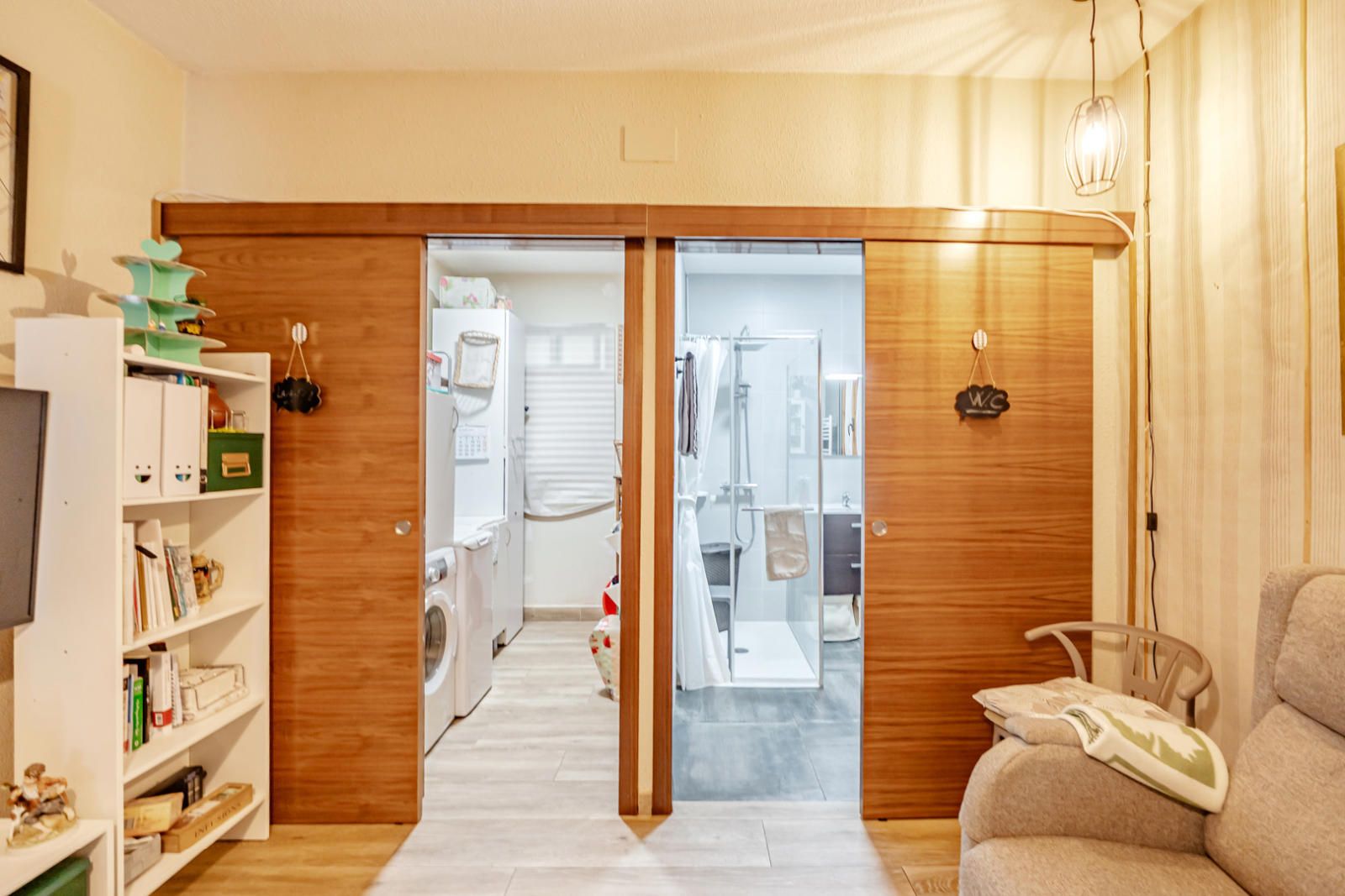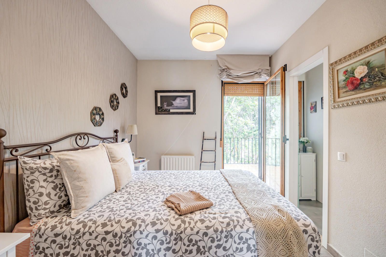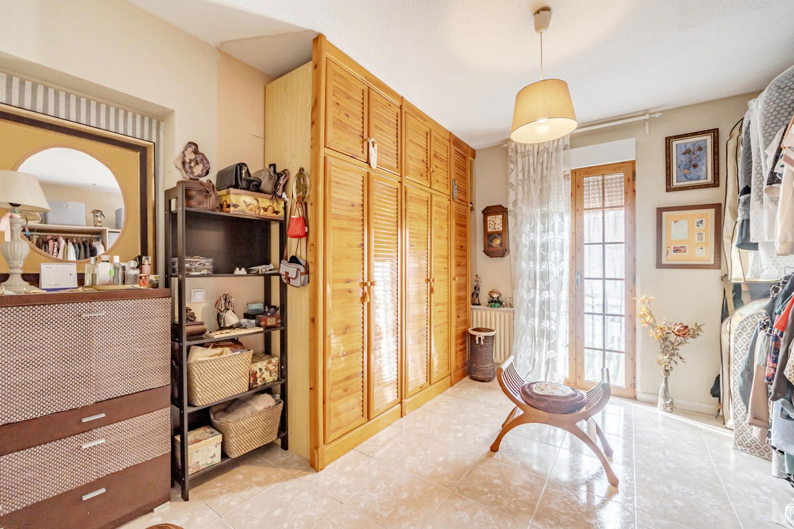La vivienda alberga un total de seis habitaciones y tres baños completos, garantizando espacio para todos. El dormitorio principal es un santuario de descanso, con un ambiente sereno y acceso a una de las dos terrazas, que cuenta con un suelo cerámico de inspiración tradicional. Además, la casa cuenta con un amplio vestidor bien organizado, con una mezcla de armarios de madera maciza y estanterías abiertas que ofrecen soluciones de almacenamiento impecables para su colección de ropa y accesorios. El diseño interior de los dormitorios combina la calidez de la madera con la sobriedad de tonos claros, creando refugios personales acogedores.