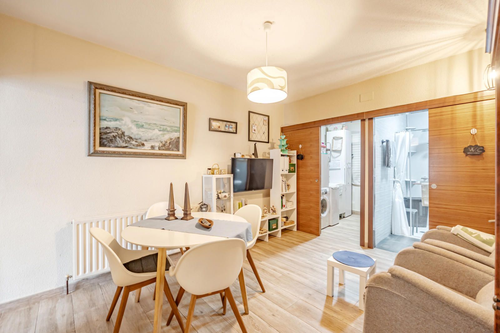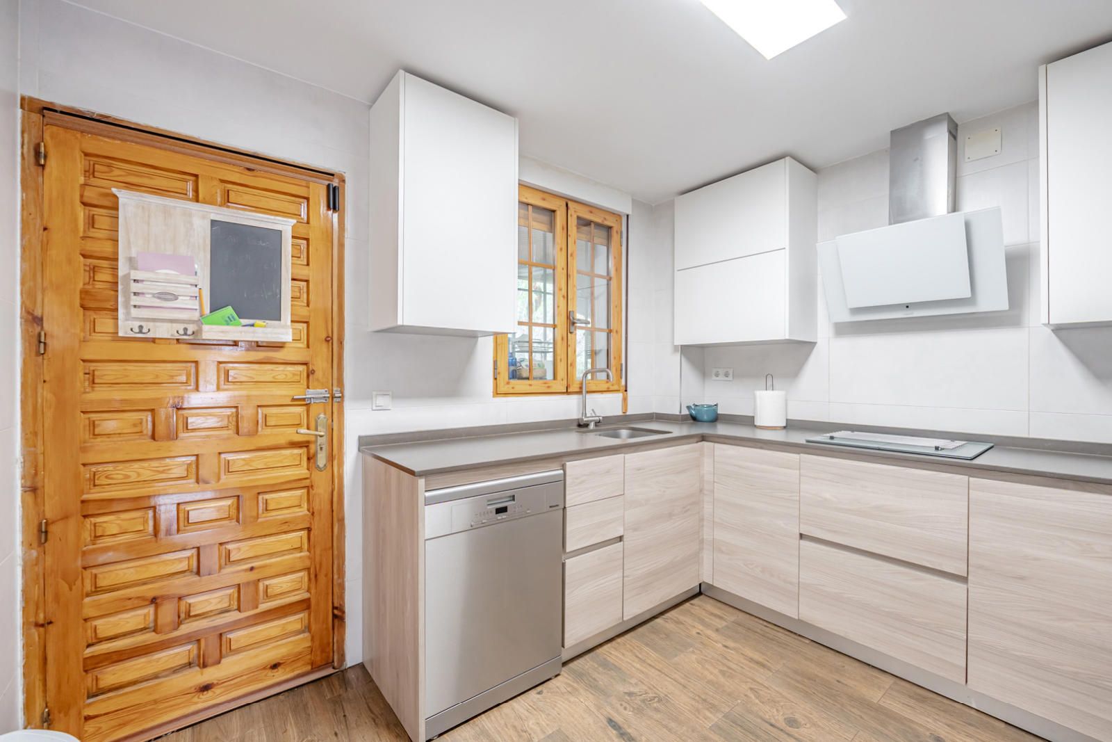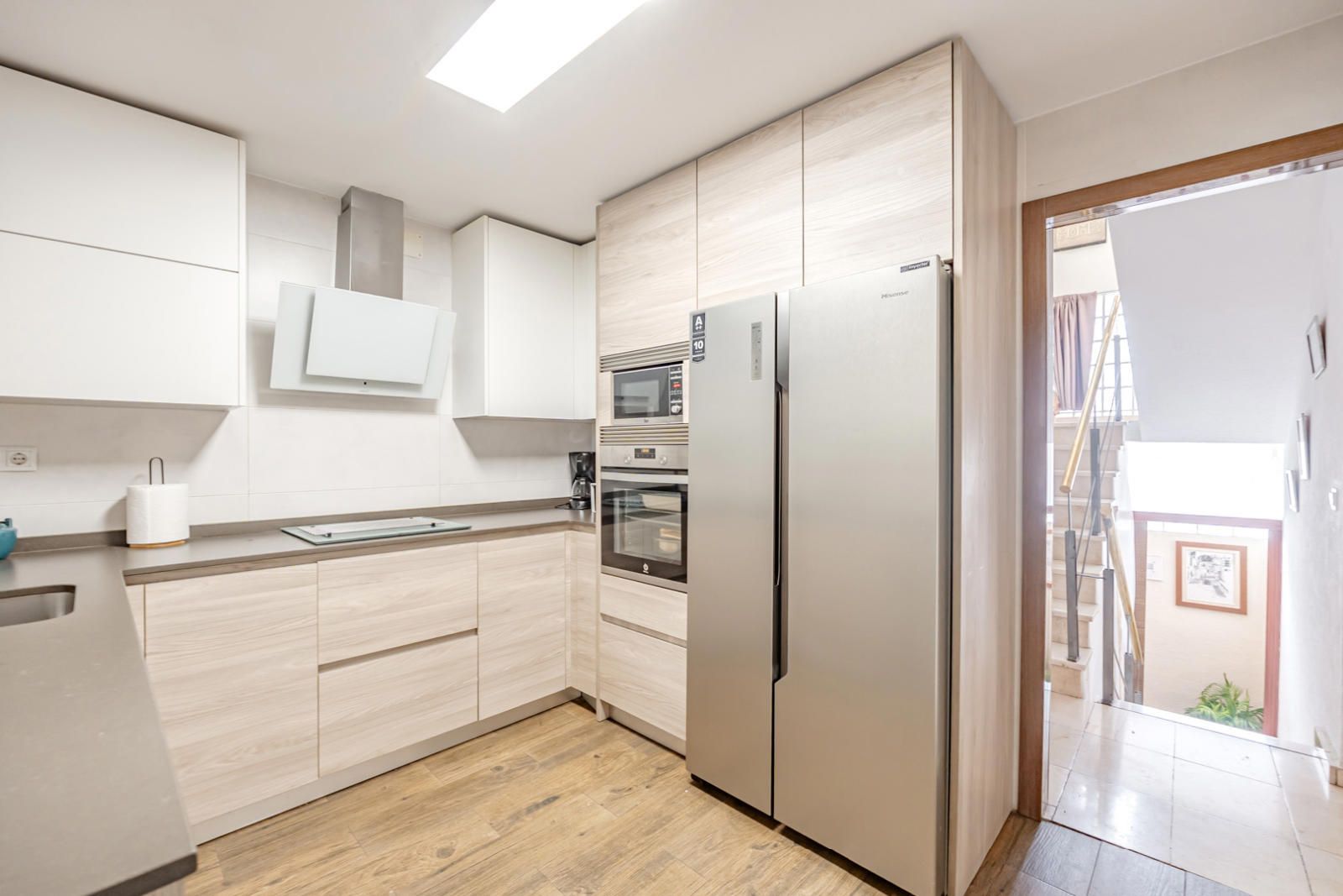 La cocina, funcional y moderna, está equipada con armarios blancos y de madera clara, electrodomésticos de acero inoxidable de alta gama (no incluidos), encimeras de color oscuro que contrastan elegantemente y un diseño limpio con iluminación integrada. Un espacio ideal para los amantes de la gastronomía.