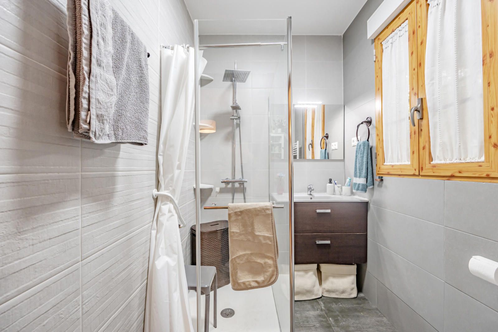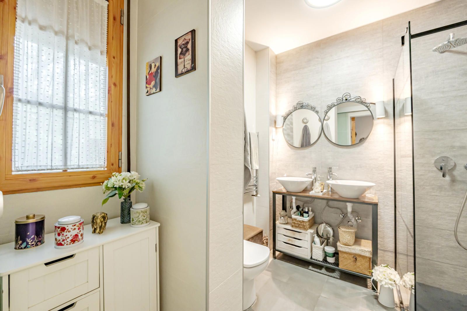 Los cuartos de baño han sido renovados con un estilo contemporáneo y funcional. Uno de ellos destaca por su doble lavabo sobre encimera, grifería moderna y una ducha con mampara de cristal de diseño, revestida con un elegante alicatado en relieve en tonos grises, ofreciendo un oasis de relajación.