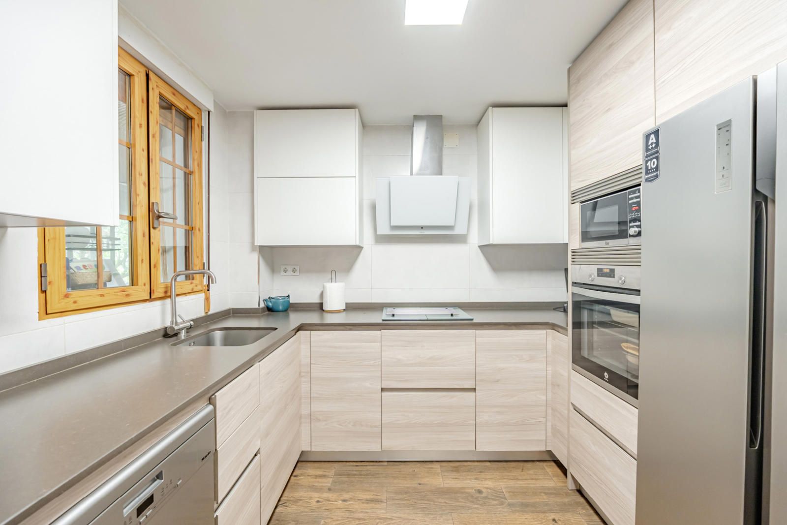 La cocina, funcional y moderna, está equipada con armarios blancos y de madera clara, electrodomésticos de acero inoxidable de alta gama (no incluidos), encimeras de color oscuro que contrastan elegantemente y un diseño limpio con iluminación integrada. Un espacio ideal para los amantes de la gastronomía.